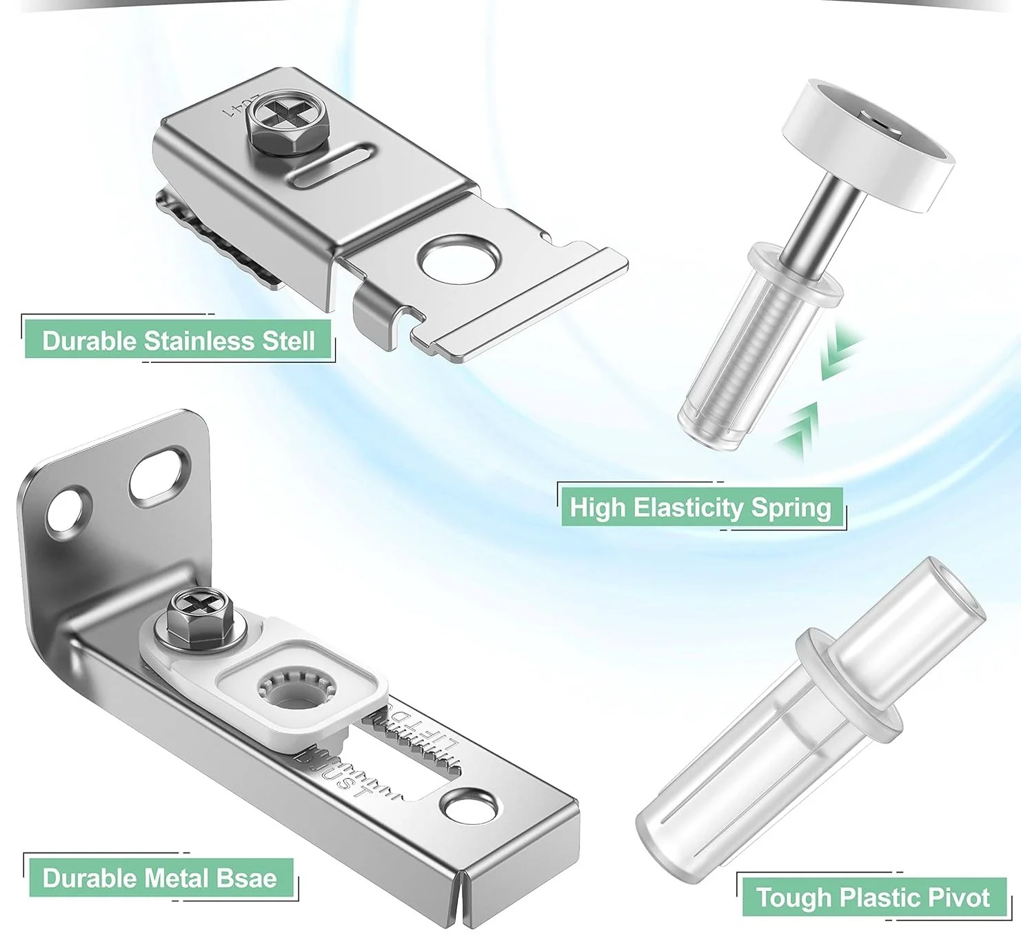 - Gama completa de piezas del kit de reparación de herrajes para puertas plegables: 1 paquete de herramientas de puerta plegable incluye 1 pivotes metálicos superiores, 1 pivotes de plástico superiores, 1 pivotes inferiores, 1 rueda guía de plástico de 7/8 «, 1 soportes de pivote inferior, 1 soportes de pivote superior, 3 sujetadores de montaje y 1 manual de instalación. Los kits de herrajes para puertas de armario pueden reparar rápida y fácilmente puertas que pesan hasta 50 libras. y con espesores que van desde 1″ a 1-3/8″, adecuado para pista de 7/8″-1» de ancho. (Tenga en cuenta: La pista y las bisagras no están incluidas.)