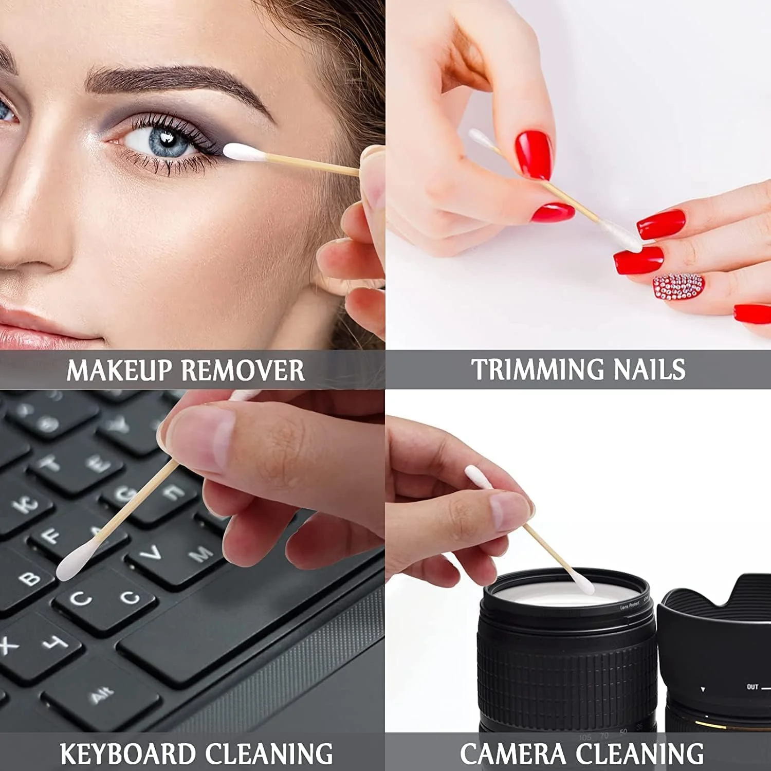 • Los hisopos de algodón son seguros de usar. El extremo de los hisopos contiene suficiente algodón para que absorba mucha agua. El mango de los hisopos está hecho de bambú y puede reducir el desperdicio de energía. Son buenos para el cuidado personal y los cosméticos.