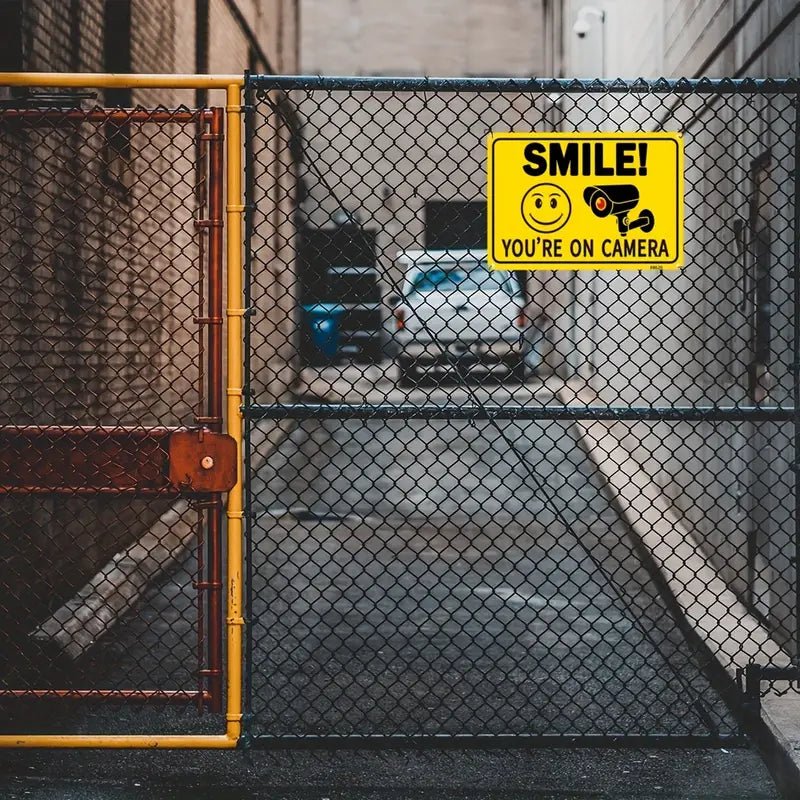 Señal de Sonríe, estás en cámara hecha con impresión de alta calidad y las letras son claras y legibles, incluso algunas personas que no conocen el inglés, una vez que vean la imagen de la cámara en uso y una cara sonriente, entenderán que están en un lugar seguro, tal vez les den una cara agradable y una sonrisa amigable.