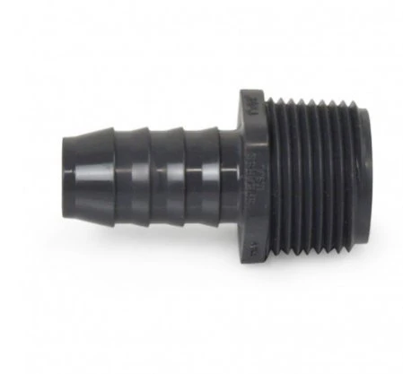 El adaptador de PVC con inserción NPT macho de 3/4″ con púas conecta una tubería/manguera flexible a una salida/válvula/conexión con rosca hembra en línea recta.