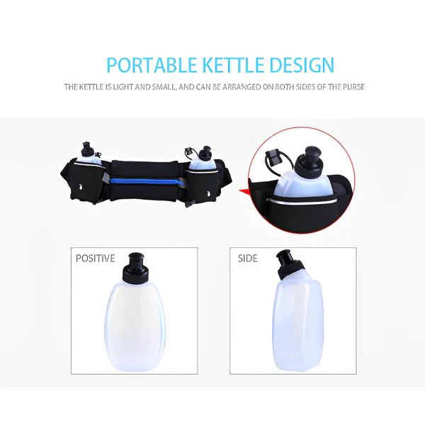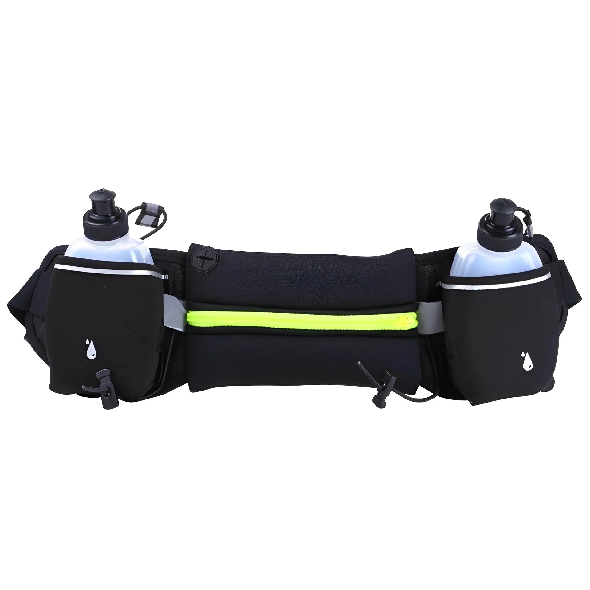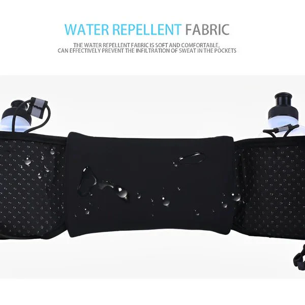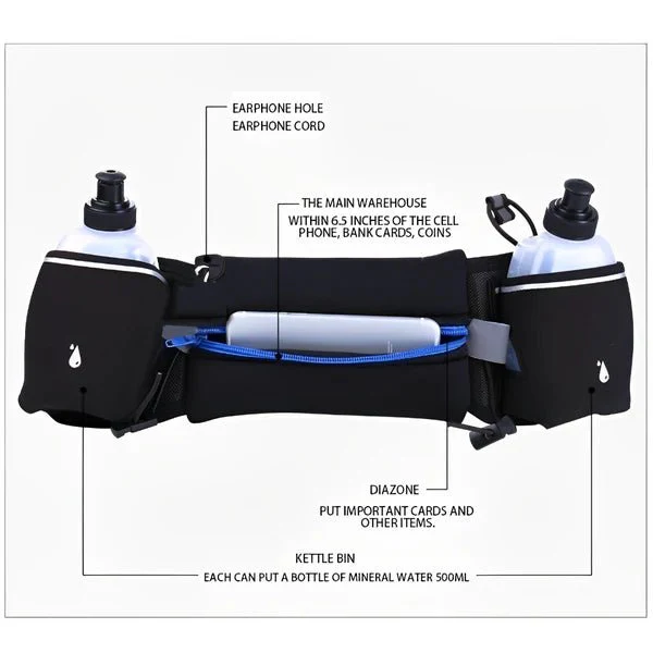 Cinturón de hidratación ajustable con dos botellas de agua de 500ml. Hecho con un tejido repelente al agua que ofrece un soporte duradero, el cinturón es ideal para actividades al aire libre y deportes. Su diseño ergonómico ofrece un ajuste cómodo que se ajusta a tus necesidades de hidratación.