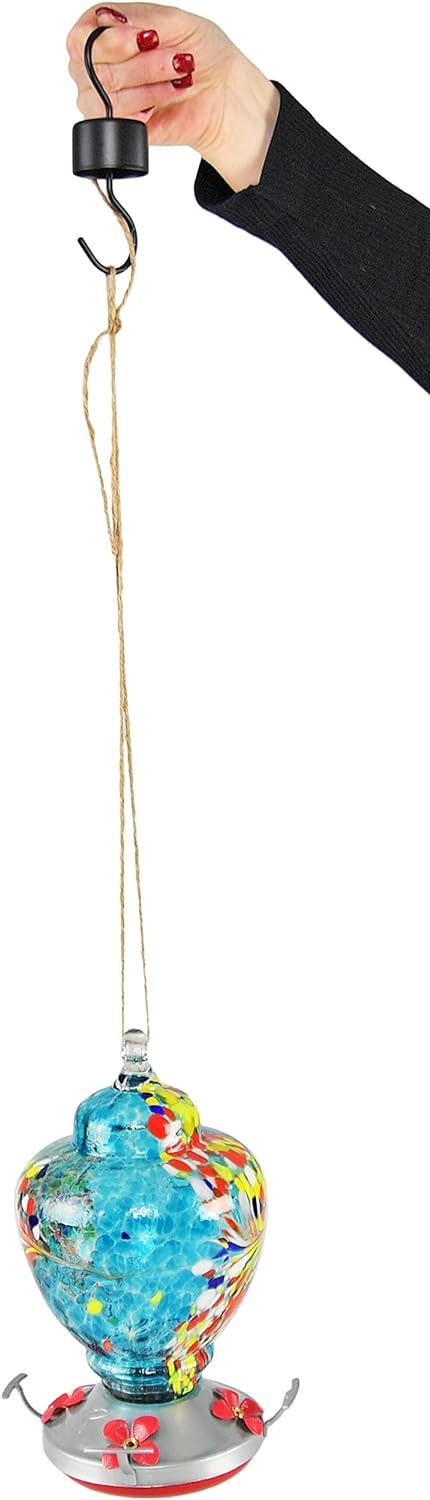 - Atrae colibríes a tu jardín: trae más colibríes a tu ventana, porche o jardín con este hermoso alimentador de néctar de vidrio, completo con un foso protector de hormigas y 4 perchas de metal para pájaros sobre coloridos puertos de alimentación. ¡Dale a los colibríes un lugar donde puedan alimentarse a sí mismos!