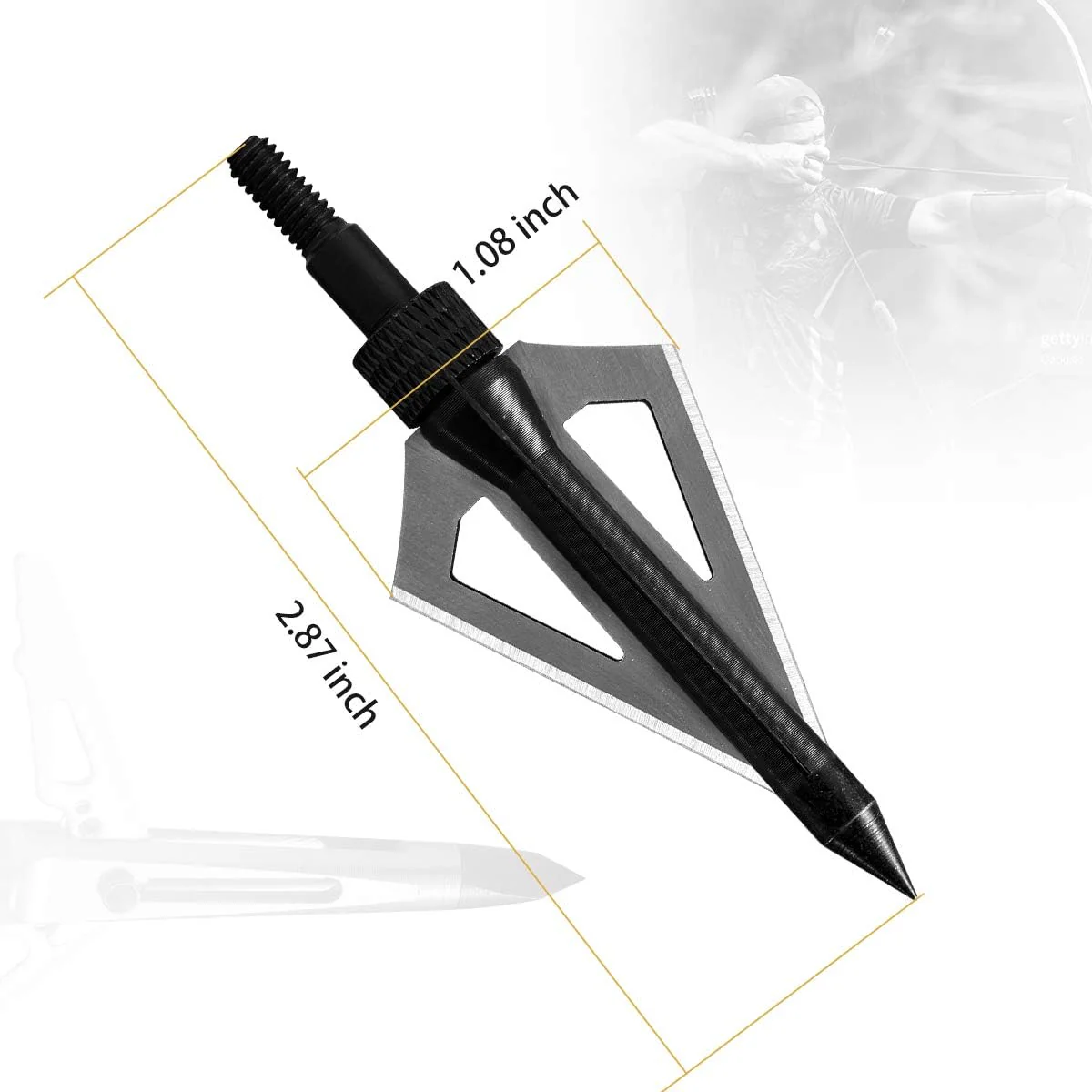 - Característica: esta punta de caza tiene 3 cuchillas fijas extremadamente afiladas, la longitud del cuerpo es de 2,87 pulgadas y el diámetro de corte es de 1,08 pulgadas.