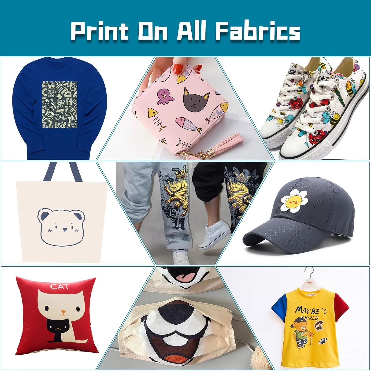 - Impreso en todos los tejidos El adhesivo termofusible de transferencia digital blanco GOZYE DTF se puede imprimir en algodón sin tratar, polialgodón, pana, lino, jeans, seda, poliéster, mezclilla, nailon, licra, cuero, mezclas y muchos otros materiales, y en todos los colores.