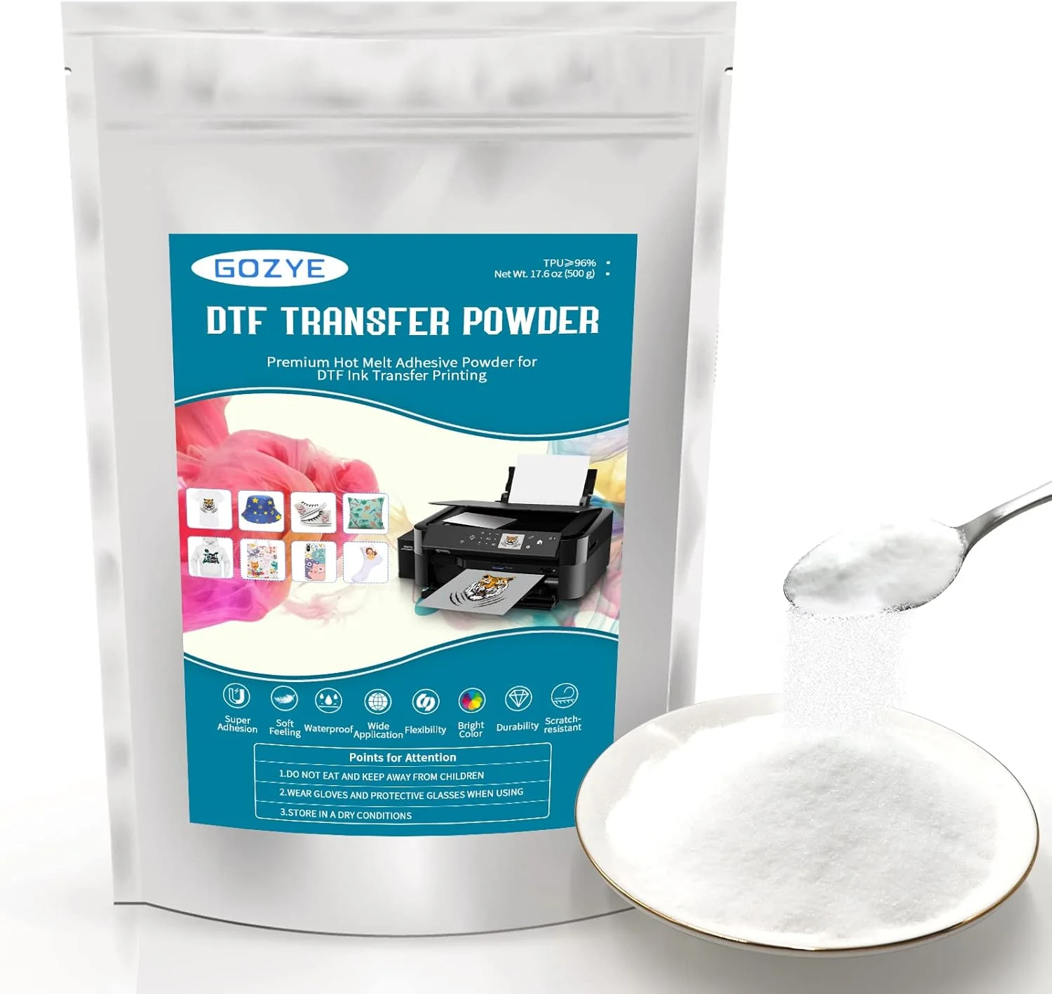 - El polvo de transferencia GOZYE DTF está hecho de 200 partículas de malla uniforme, que es un polvo fino que cubre completamente las líneas finas, las partículas son más uniformes, el patrón en la ropa es más suave. Fuerte adhesión El polvo GOZYE DTF está hecho de poliuretano de alta pureza, TPU ≥96%, muy pocas impurezas, punto de fusión más bajo que el polvo ordinario y se puede fundir completamente a 110, lo que proporciona un punto de fusión de alto rendimiento para la impresión por transferencia directa de textiles. viscosidad corporal.