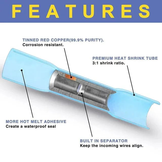 Núcleo de cobre de alta calidad: los conectores termorretráctiles utilizan un núcleo de cobre con un mayor espesor. ¡Esto hace que su proyecto de conexión sea más seguro y satisfaga mejor las necesidades de calidad de nuestros clientes!