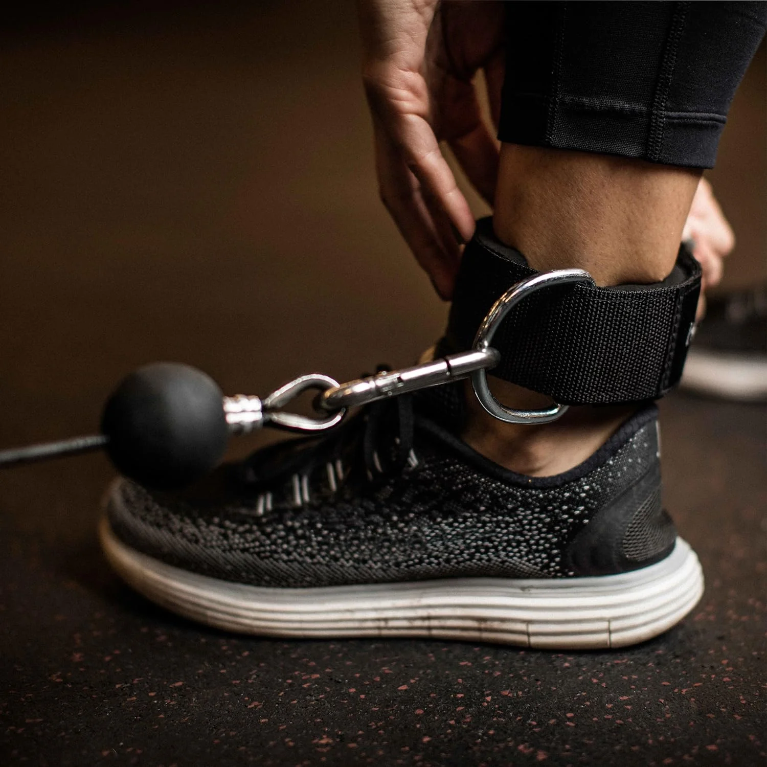 - El anillo en D de acero resistente se engancha a los cables universales del gimnasio.