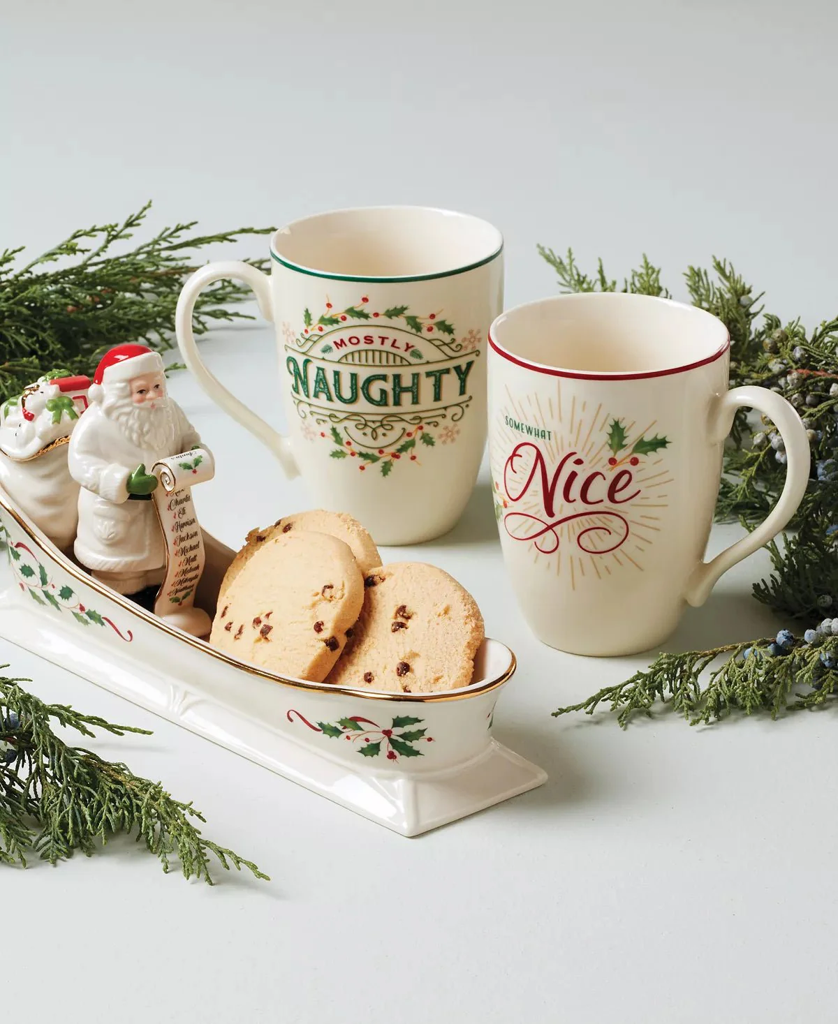 Disfrute de la alegría festiva con el juego de tazas Holiday Mr. & Mrs. de Lenox, que incluye un par de tazas con motivos de hojas de acebo.