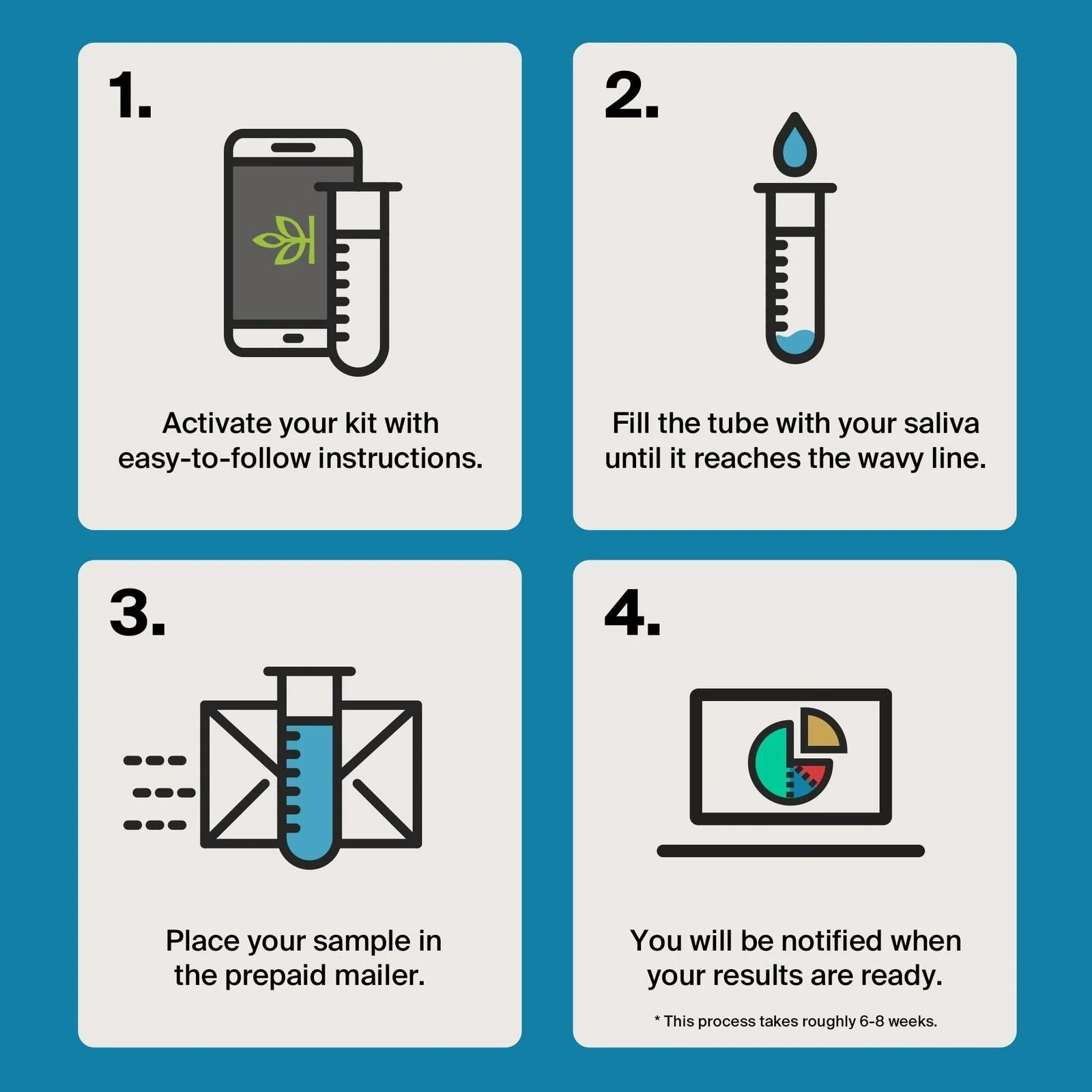 ALGUNOS PASOS SIMPLES: Simplemente active su kit de ADN en línea y devuelva su muestra de saliva en el paquete prepago a nuestro laboratorio de última generación. Sus resultados estarán disponibles en línea en aproximadamente seis a ocho semanas.
