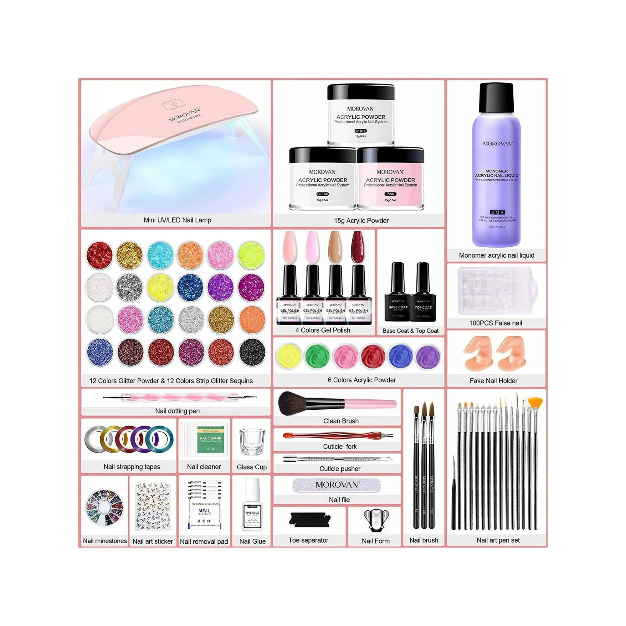 Juego de polvos acrílicos: el kit de uñas acrílicas profesional Morovan El polvo acrílico son polímeros sin burbujas que ofrecerán una claridad extraordinaria y proporcionarán un acabado suave autonivelante. El polvo acrílico también es muy simple de usar, solo toma de 6 a 7 minutos para secarse por completo y puedes crear tu estilo de uñas favorito a voluntad.