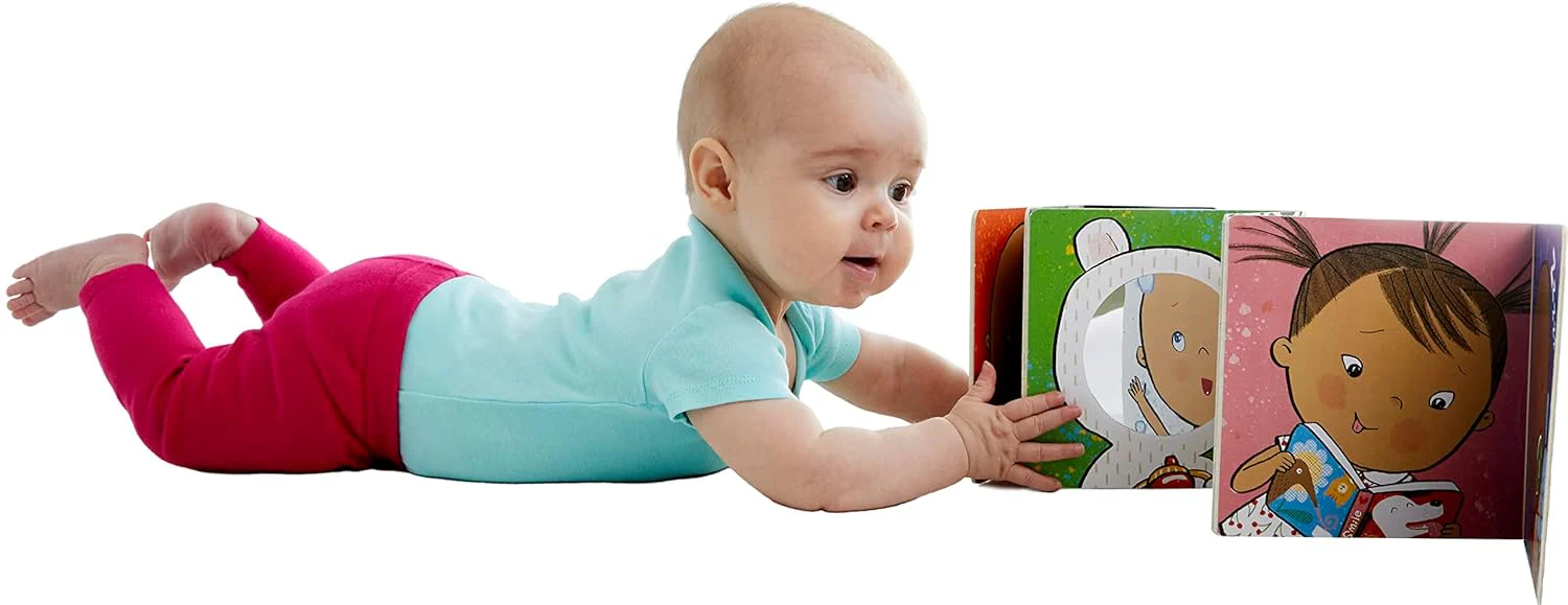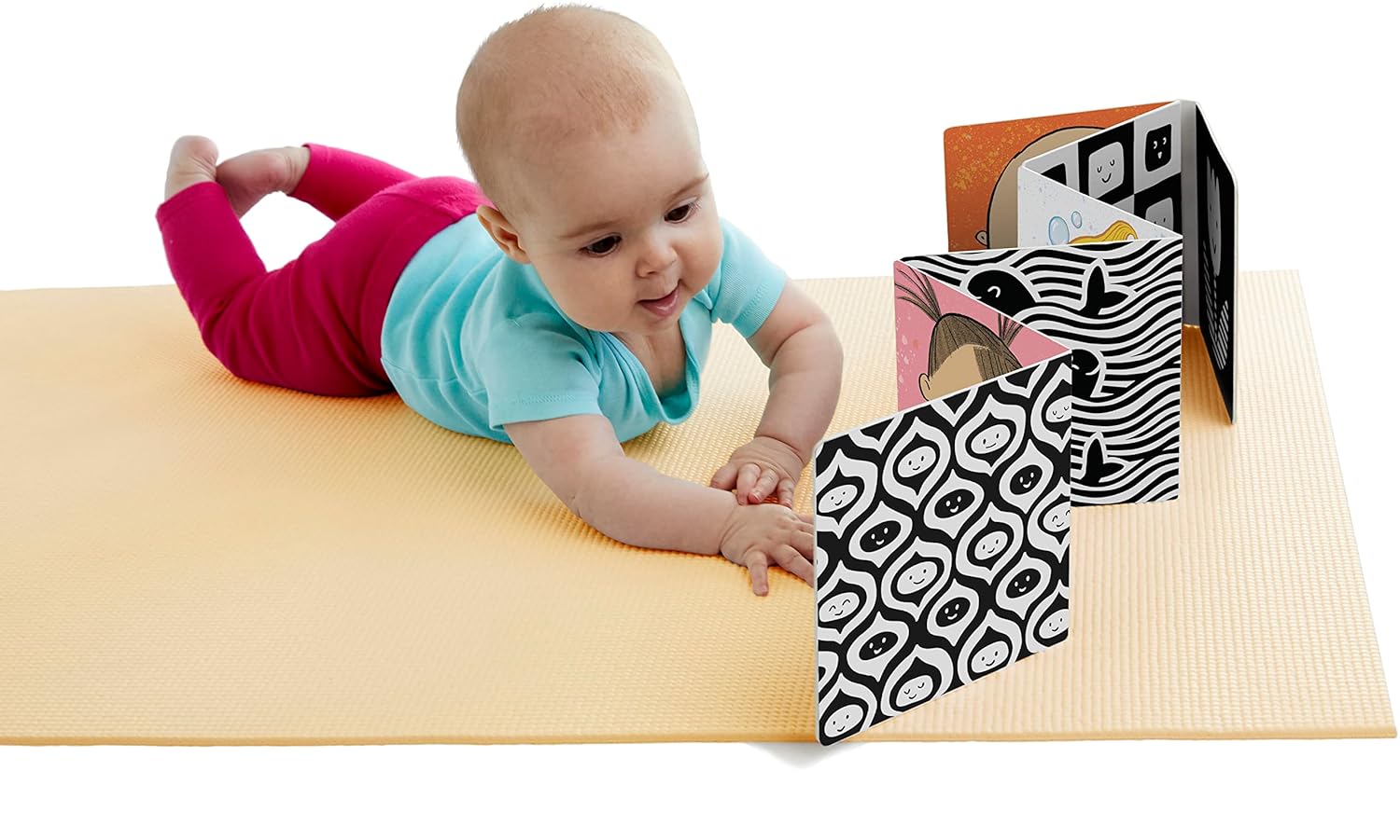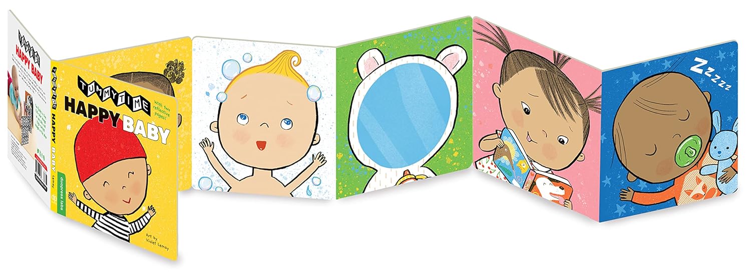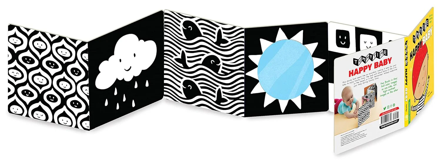 Este resistente libro en acordeón se abre para colocarse de pie en una cuna, sobre la alfombra o en una cama, lo que facilita que tu bebé disfrute del tiempo boca abajo en todo momento. Un lado presenta ilustraciones vibrantes de bebés sonrientes y otras imágenes alegres, y el lado opuesto tiene patrones en blanco y negro de alto contraste, perfectos para los ojos en desarrollo del bebé. ¡Y con dos páginas reflectantes, tu bebé puede verse a sí mismo y practicar esas futuras sonrisas!