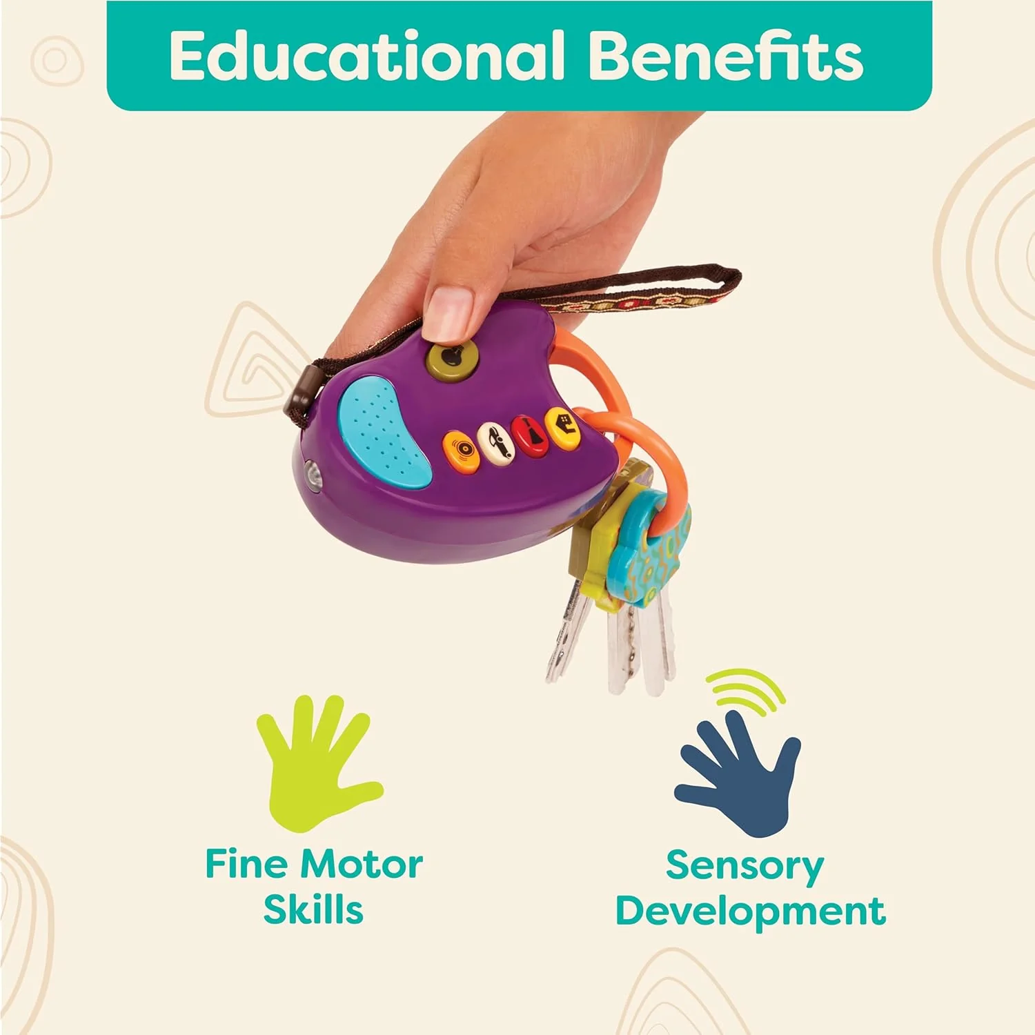 - ECOLÓGICO: En B. tendemos a hacer las cosas de manera diferente. Nuestro embalaje es 100 % reciclable y está elaborado con tintas a base de soja. ENCENDE TU MOTOR: Juguete perfecto para llevar. Coge la correa acolchada y lleva este juego de llaves de coche de juguete a dar una vuelta. LÍMITE DE EDAD: Este juego de llaves de juguete para niños pequeños se recomienda para niños de 10 meses en adelante. DIMENSIONES Y PILAS: Se incluyen 2 pilas AAA. Este juguete mide aproximadamente 7″ (L) X 2,5″ (W) X 1″ (T). CONFIABLE: Battat es una empresa familiar fundada en 1897.