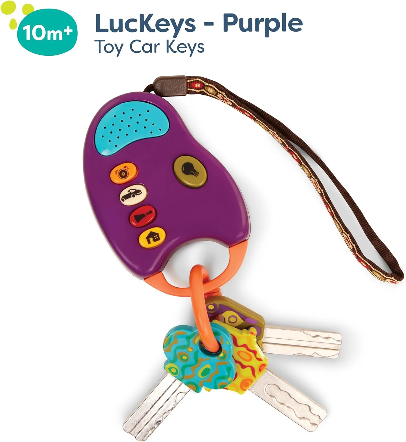 - BEBÉ, PUEDES CONDUCIR MI AUTO: Un diseño realista en un divertido juego de llaves de juguete junto con un control remoto violeta funcional con sonidos de auto y una linterna. El llavero tiene capacidad para 3 llaves de diferentes formas y colores que se balancean libremente. ¡DIVERSIÓN para el bebé!