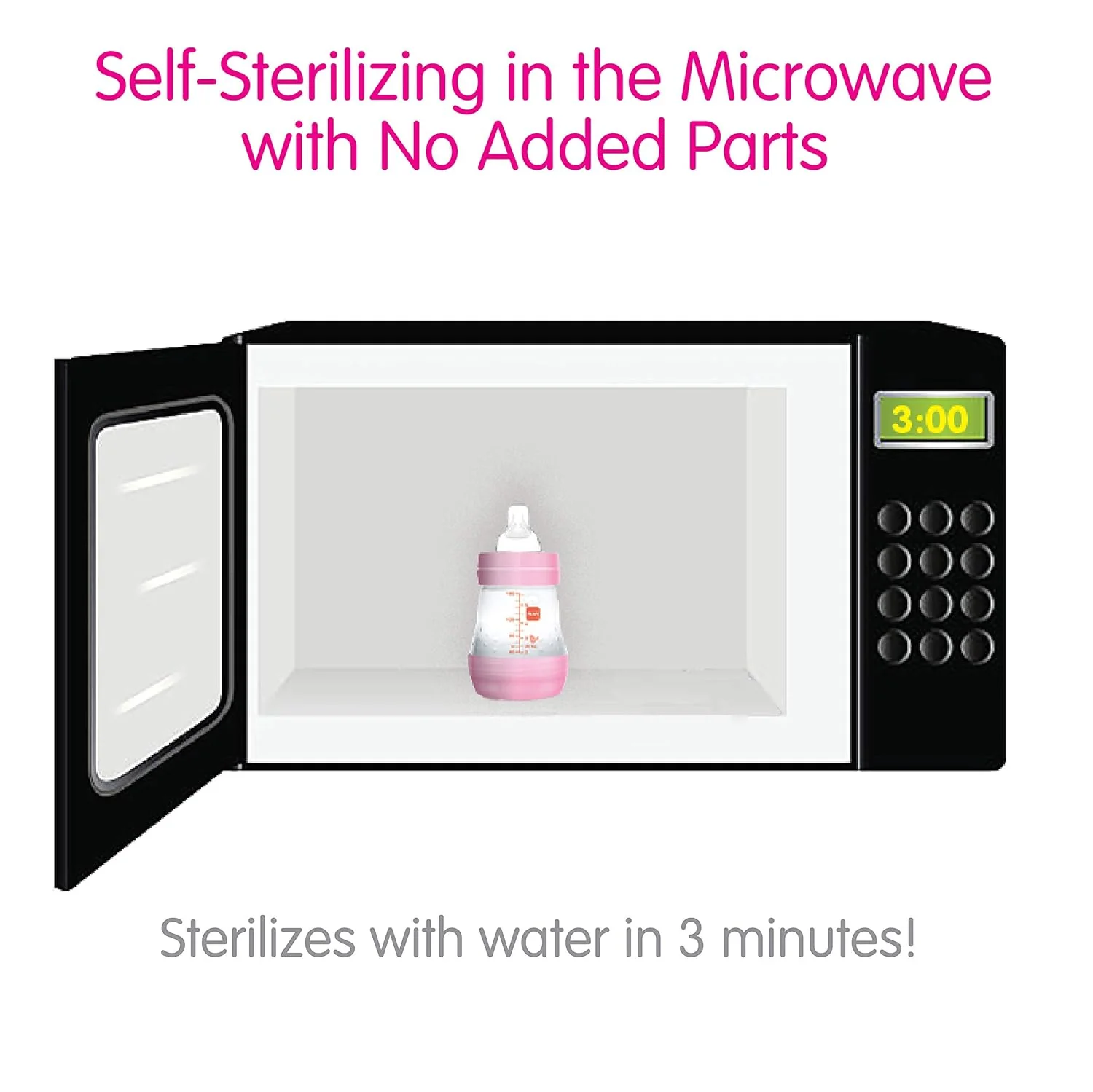 - Fácil de limpiar: no hay necesidad utilizar un esterilizador de biberones por separado: Los biberones MAM se esterilizan en el microondas en 3 minutos, lo que significa llevar menos artículos para bebés cuando vas sobre la marcha