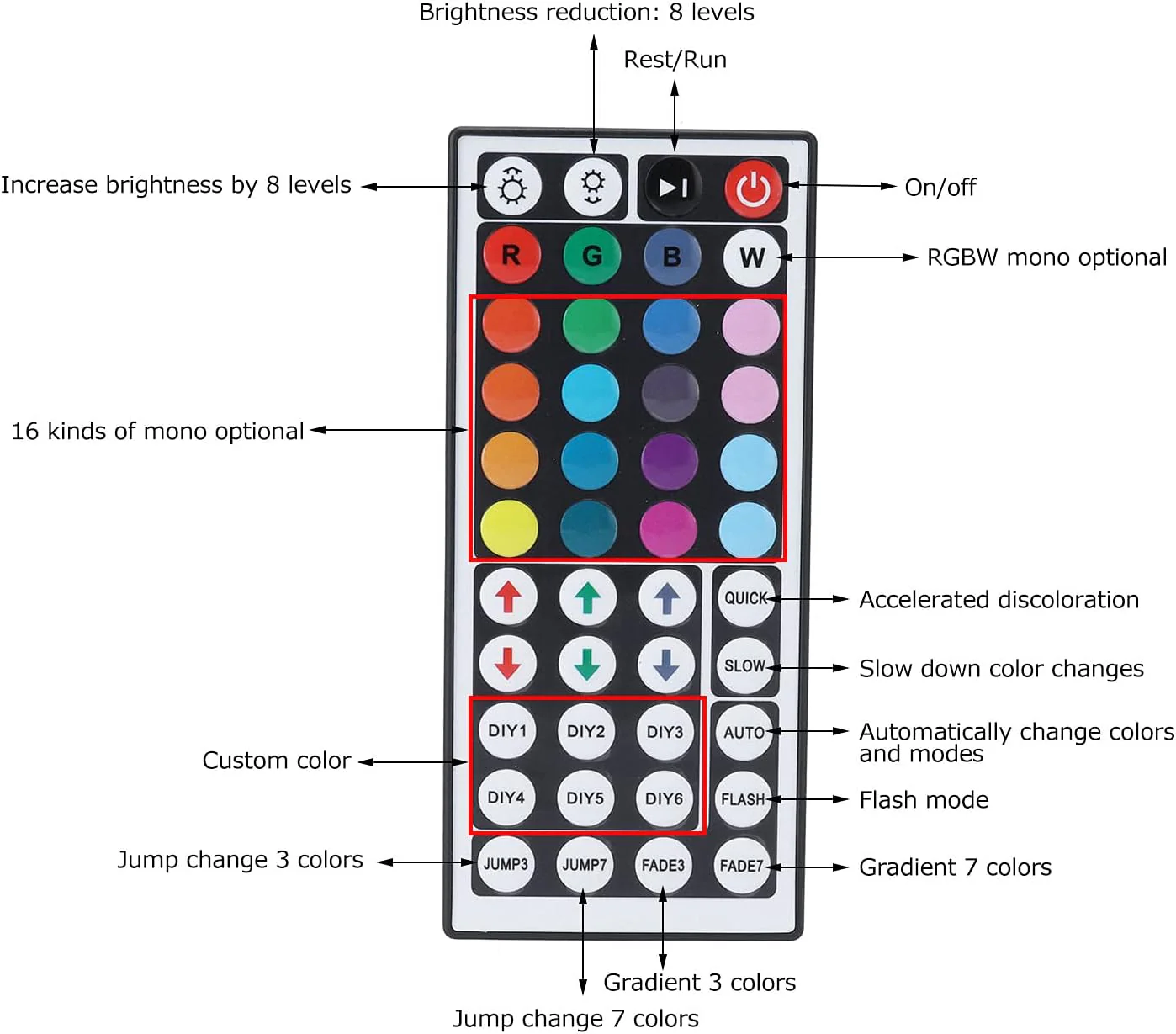 - DISEÑO DE RENDIMIENTO: Con control remoto de 44 teclas, 8 tipos de niveles de brillo, RGBW, 16 tipos de colores secundarios, 6 tipos de colores personalizados de bricolaje, se puede ajustar la velocidad de la luz.
