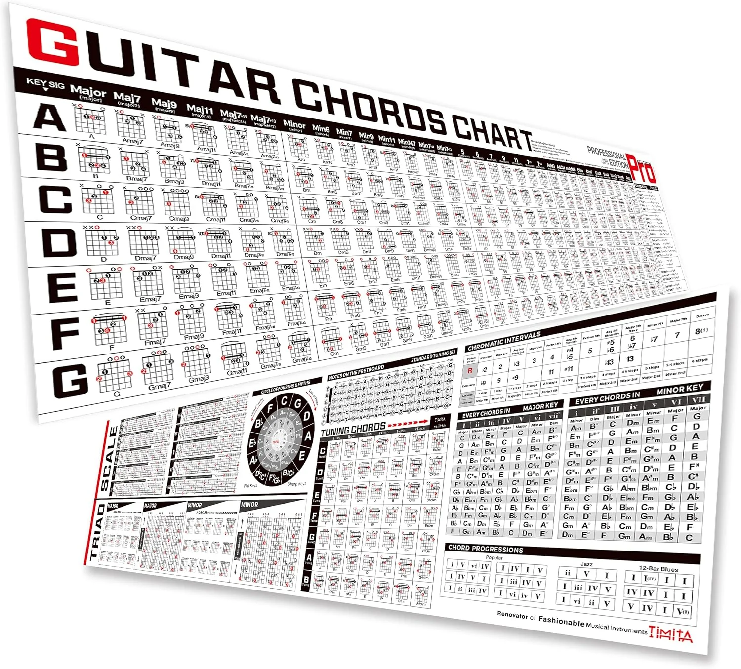 • 🎸Aprendiendo guitarra: Ya sea en el aula o en la sala de ensayo, este póster proporciona una representación clara y comprensible de acordes de guitarra, diagramas de acordes y escalas. Una herramienta útil para todos los guitarristas que quieren mejorar sus habilidades. También disponible como tabla o diagrama en un libro.