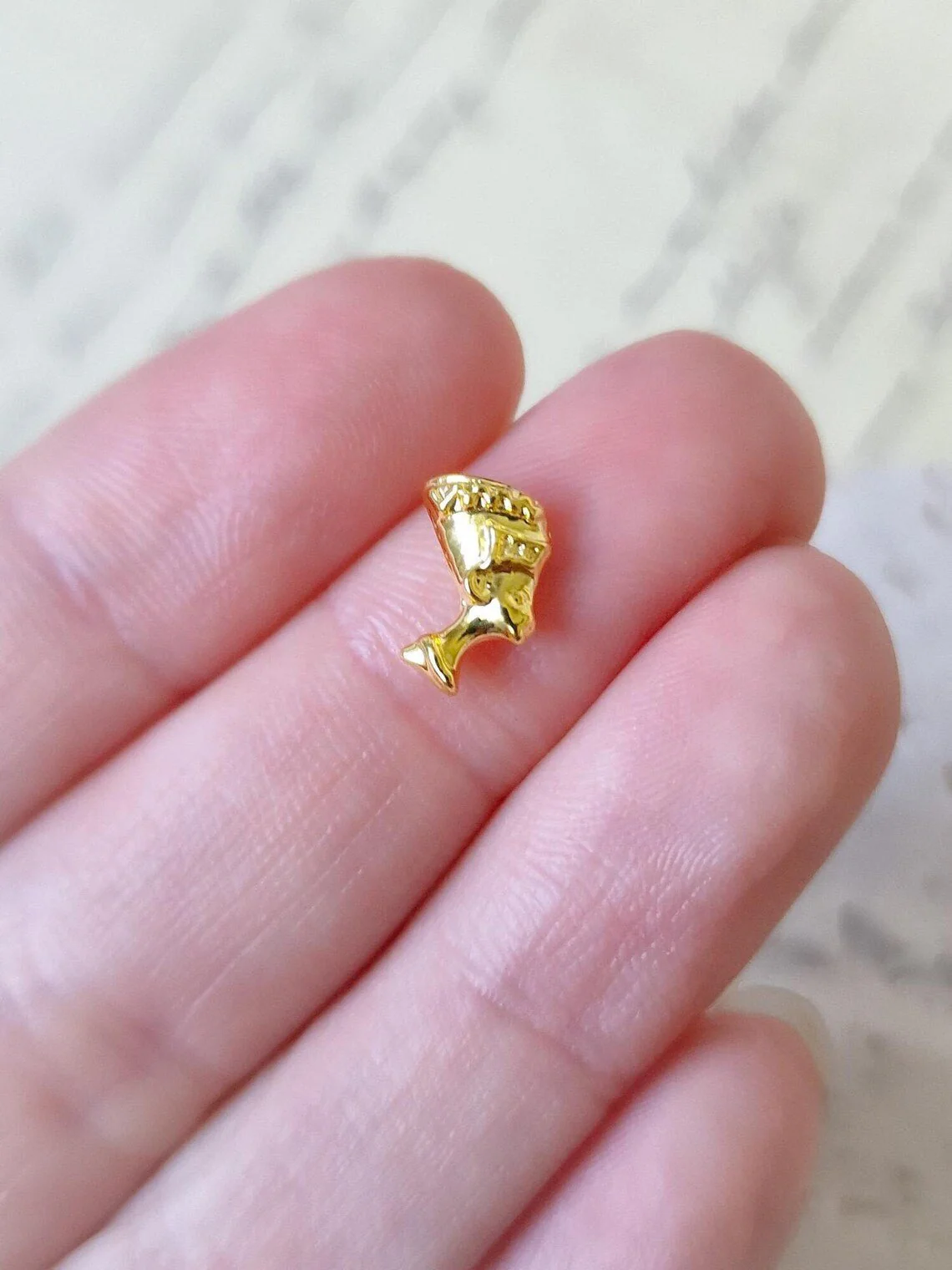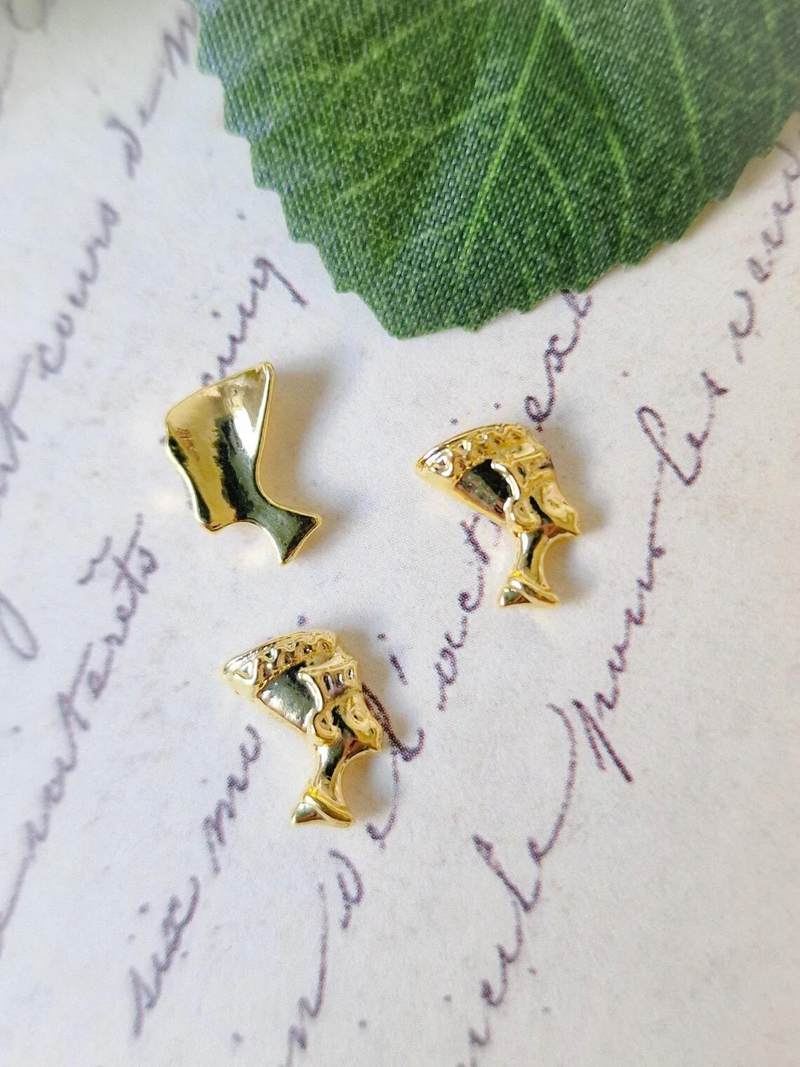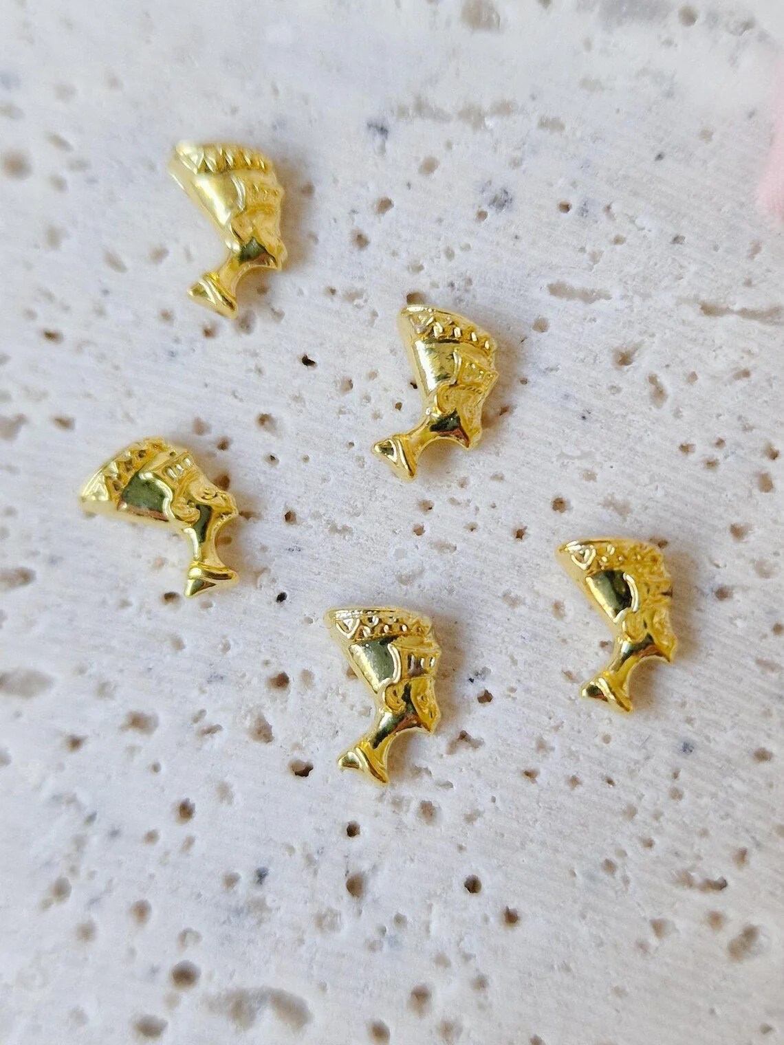 5 piezas de dijes de arte de uñas Nefertiti en tono dorado. Las partes traseras no son planas, están moldeadas para adaptarse a la uña con una ligera curva. Parte trasera plana de metal chapado en imitacion de oro.