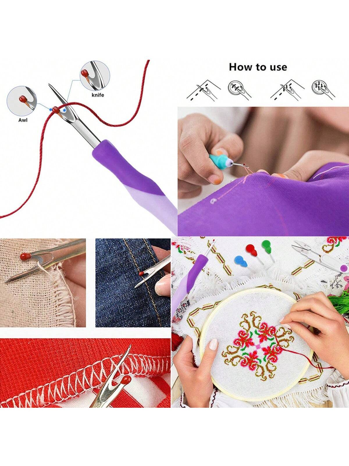 4 Piezas/set Kit De Herramientas De Costura A Mano Para Bordado De Punto Cruz Con 1 Raspador Grande Con Mango De Silicona, 1 Raspador Pequeño De Plástico, 2 Tijeras De Acero Al Carbono En Forma De U Color Morado Y Enhebrador Rápido