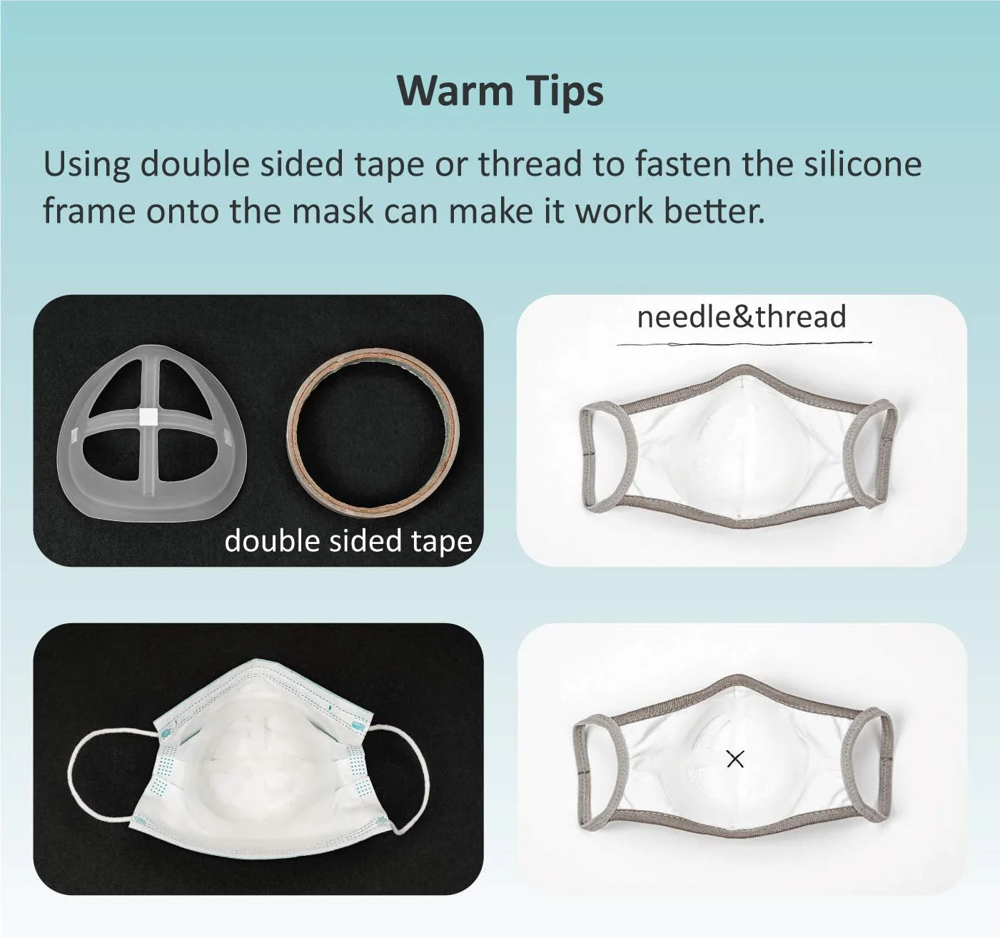 - Consejos útiles: usar cinta de doble cara o hilo para fijar el marco de silicona a la máscara puede hacer que funcione mejor.