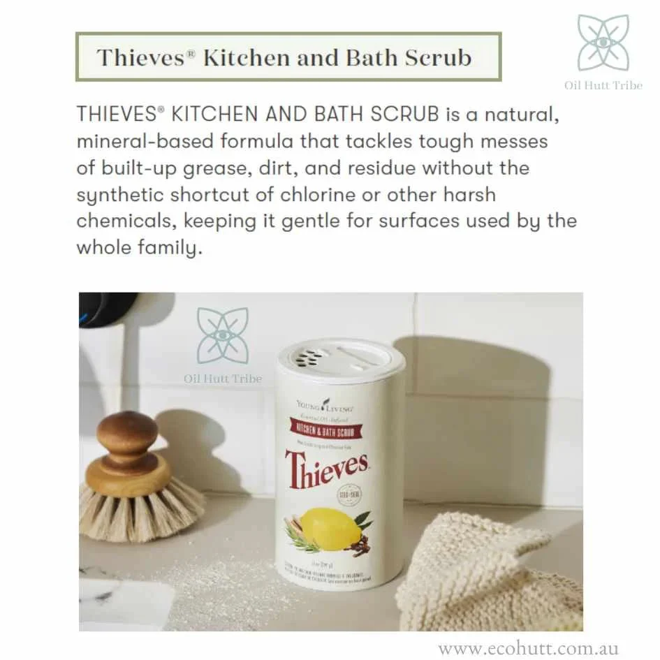 Thieves Kitchen and Bath Scrub te brinda el poder de un exfoliante de superficies libre de olores y residuos químicos nocivos. Thieves Kitchen and Bath Scrub obtiene su fuerte poder de limpieza de la nefelina sienita, un mineral que obtenemos de fuentes extraídas de forma responsable en Ontario, Canadá; bicarbonato de sodio que absorbe suavemente los olores; percarbonato de sodio que libera oxígeno cuando se combina con agua, proporcionando un poderoso impulso de poder de limpieza contra las manchas difíciles; y la mezcla exclusiva Thieves de Young Living. Diseñado para usarse en múltiples superficies, Thieves Kitchen and Bath Scrub es su nuevo limpiador de origen natural: resistente a la suciedad y seguro para su familia.