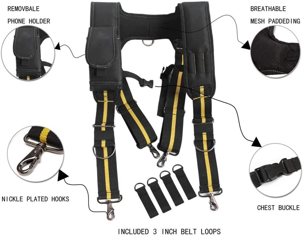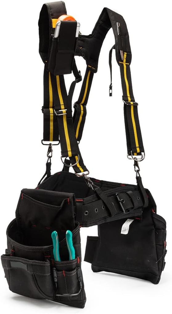 - Múltiples bolsillos reforzados para herramientas y accesorios de trabajo. El cinturón de herramientas es ajustable para adaptarse a muchos tipos de cuerpo.