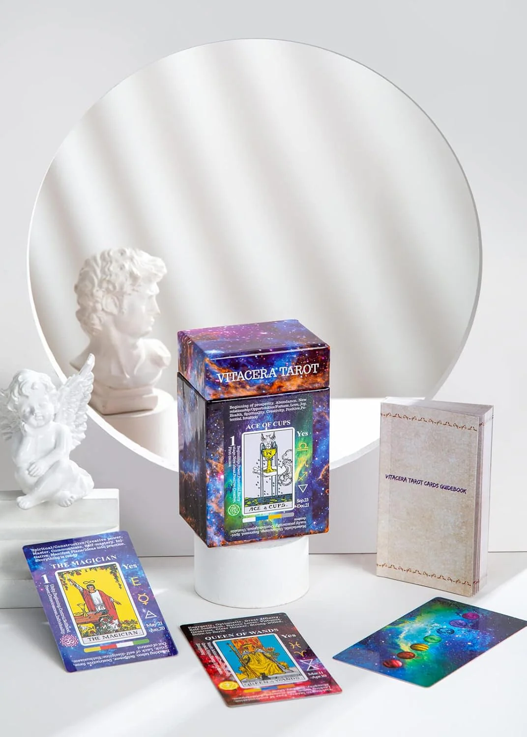 - Vitacera El tarot puede ayudarte a aprender el tarot rápidamente sin tener que consultar el folleto a menudo. Viene con una guía de 214 páginas, y si necesita más información, la guía en la caja le dará alguna referencia.
